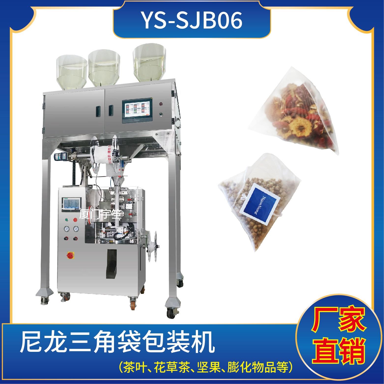 YS-SJB06尼龍三角袋包裝機(電子秤系列) 特點 1、適用于綠茶、紅茶、花茶、咖啡、中國茶、健康茶、中藥茶、顆粒等。2、可用于平面袋包裝、三角立體包裝等形式包裝袋。3、整機可自動完成上料、計量、制袋、封口、切斷、計數(shù)、成品輸送等功能。4、選用進口超聲波封口,電子稱計量下料方式,封口牢固,下料準確。5、包裝材料:…